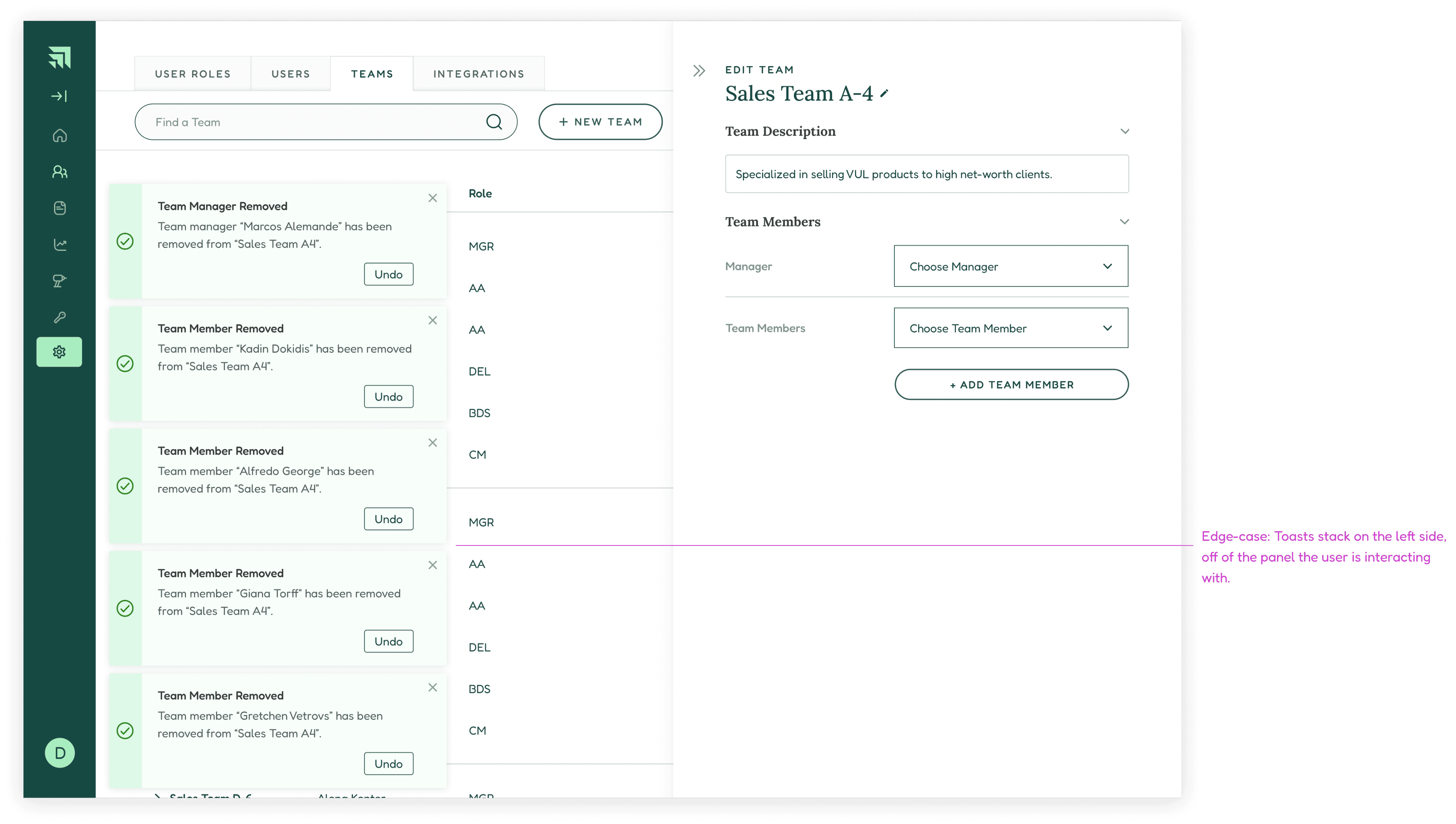 Toast notification stack when many team members, including managers, are deleted using a “Teams” panel