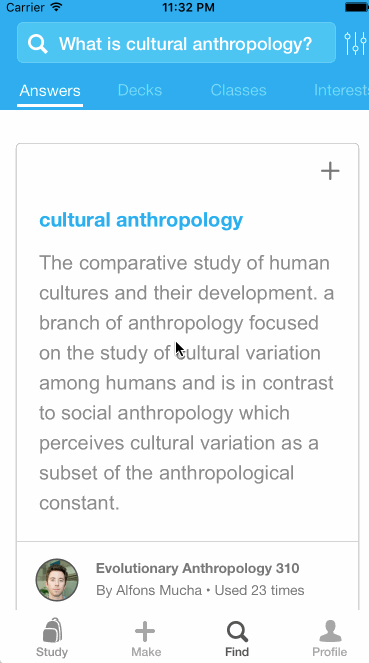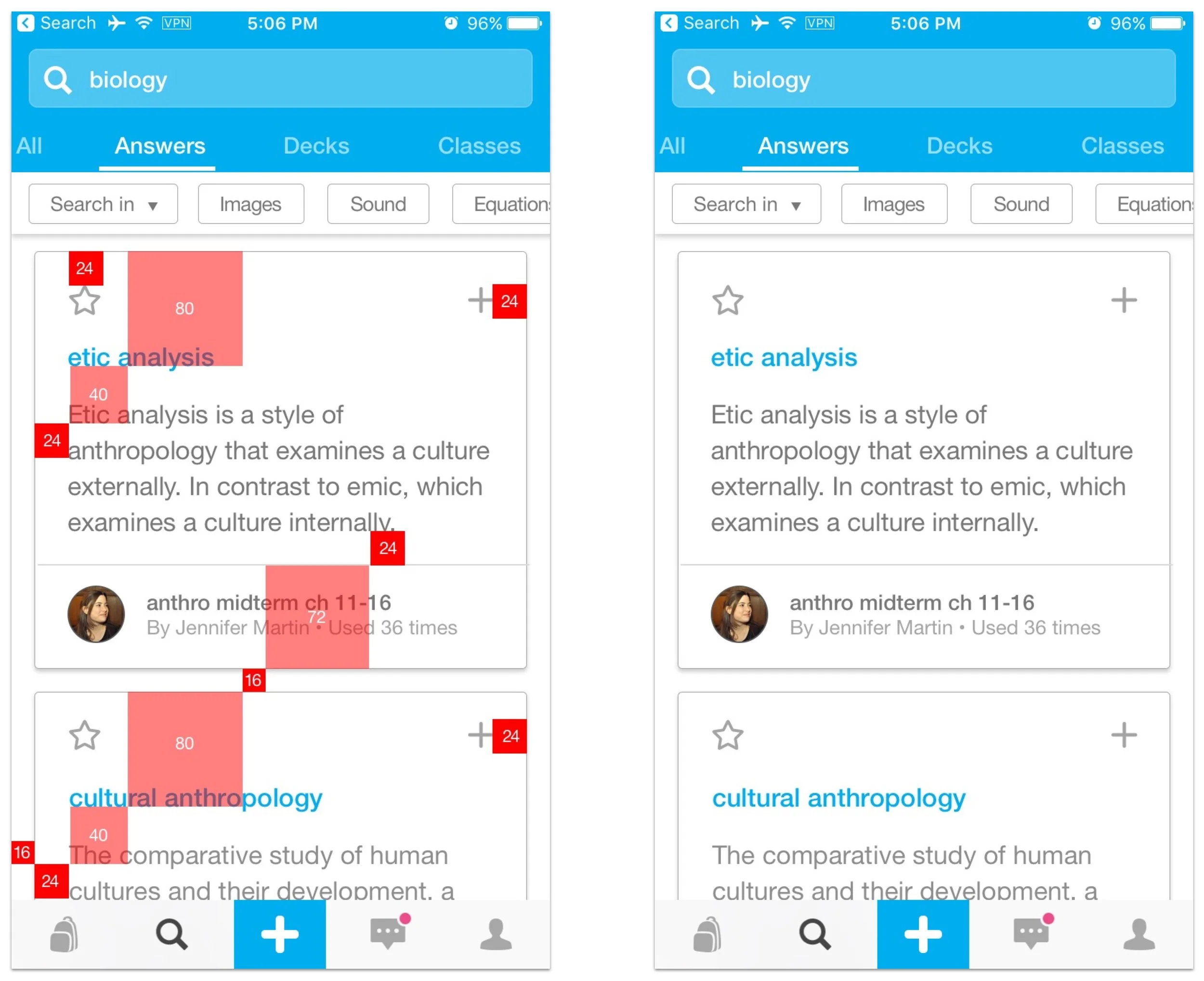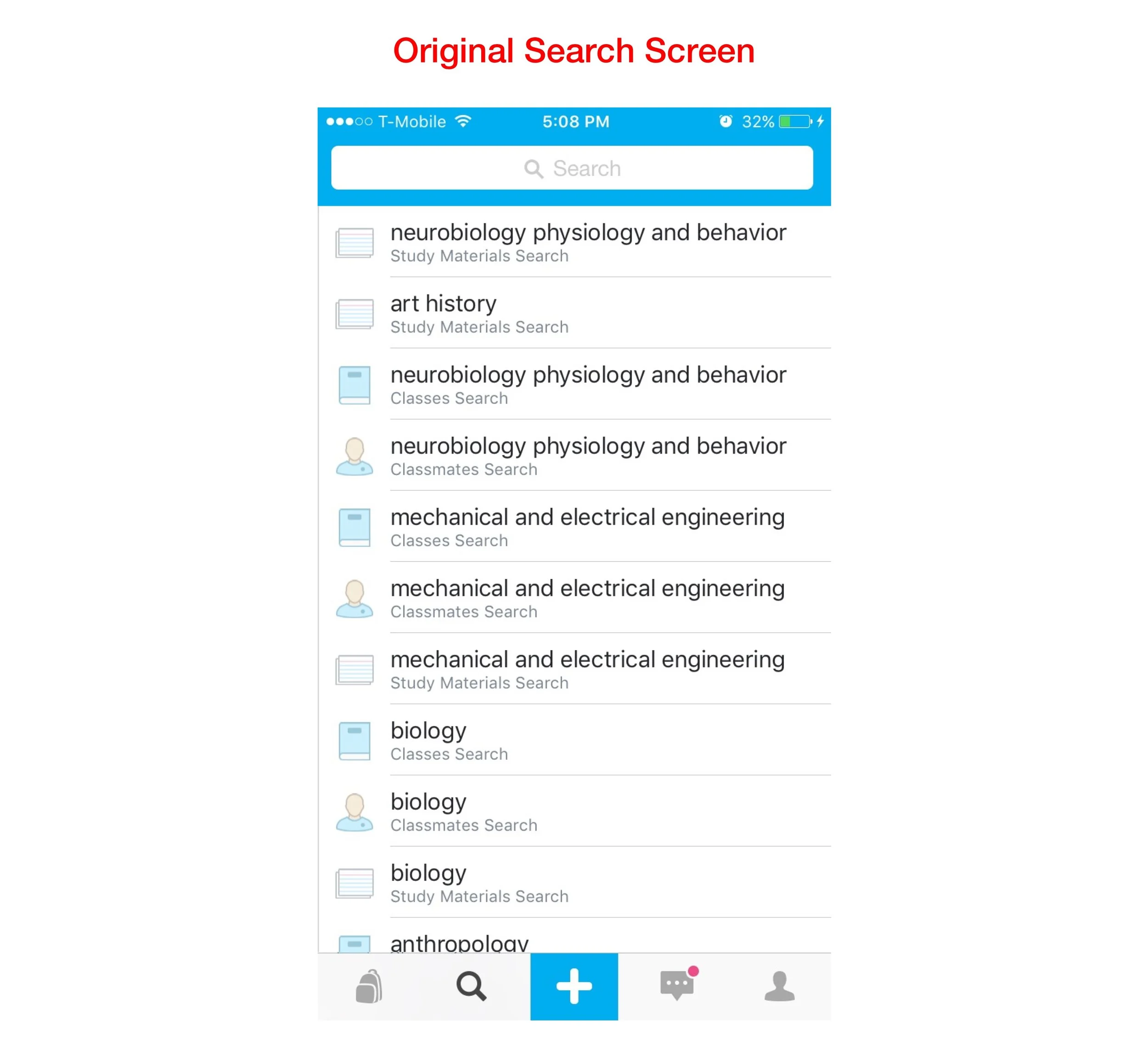 The original search experience displayed all content as one massive string of results. And users could not find individual cards. The Homework Help feature led to a full Search redesign.