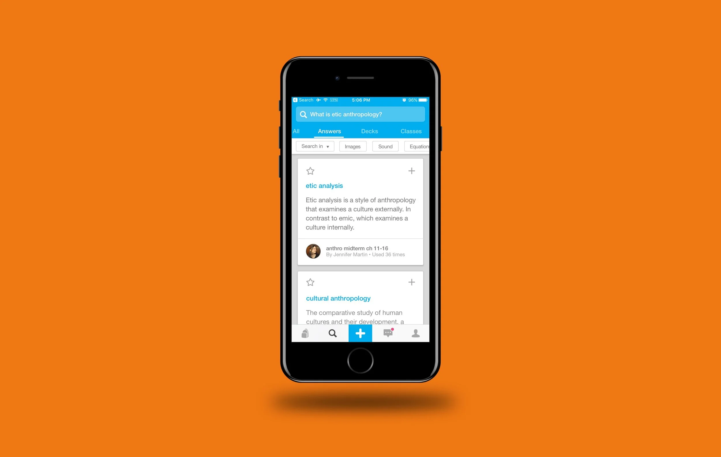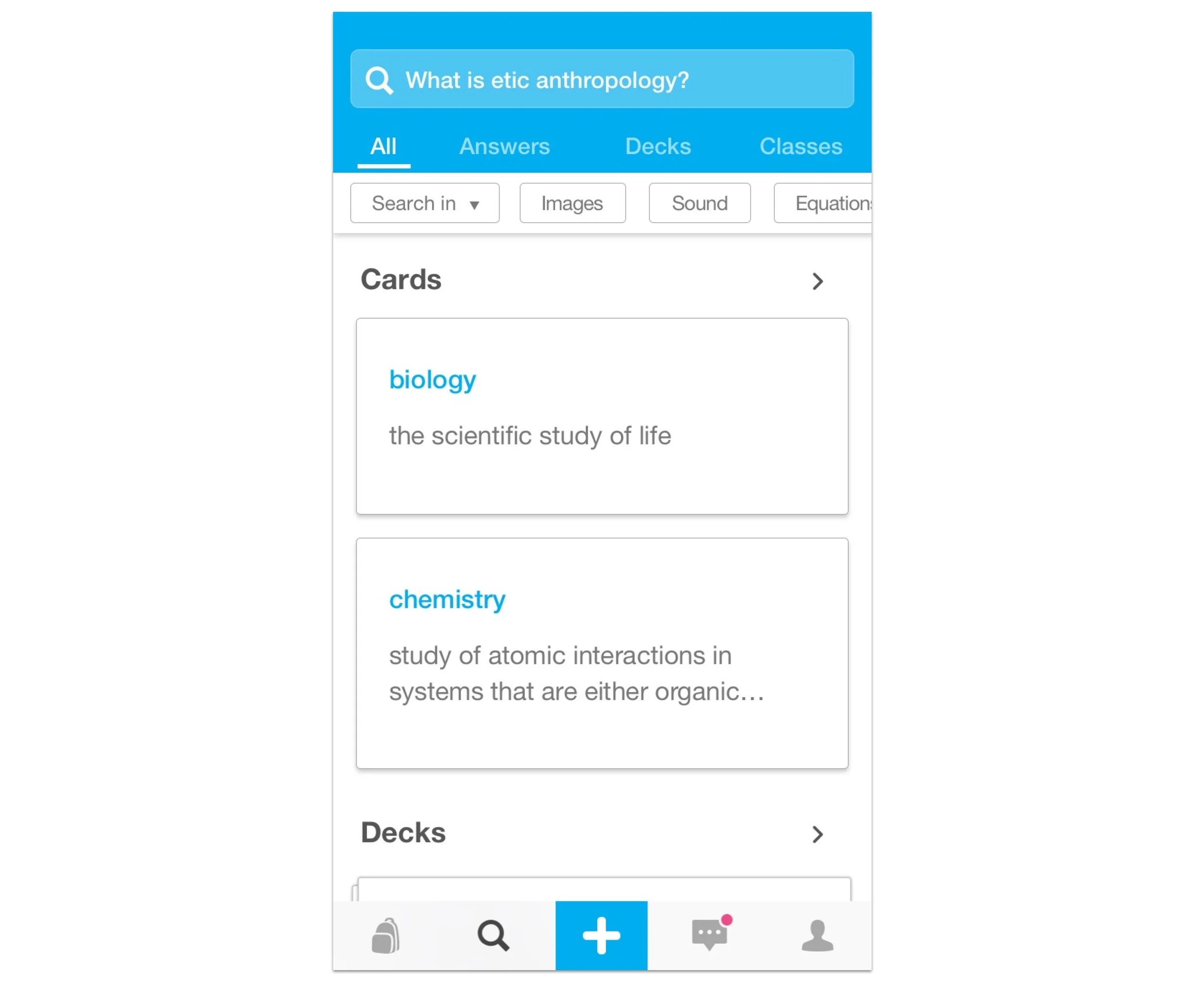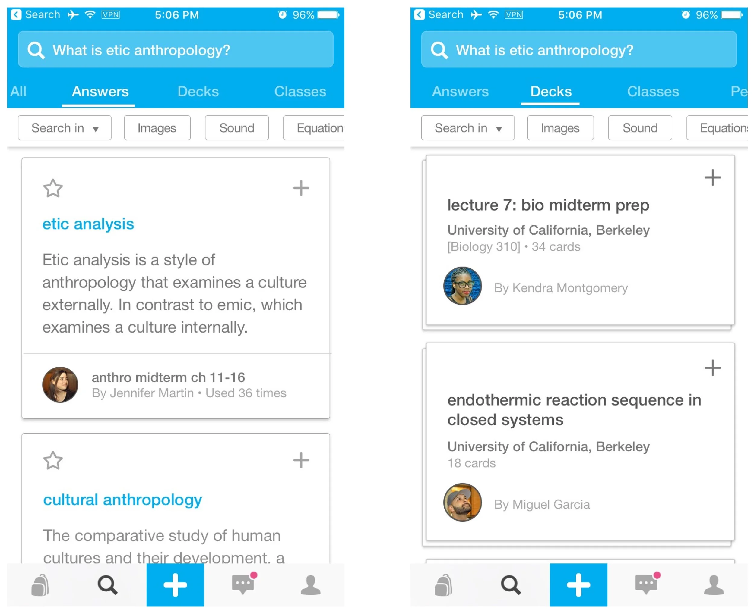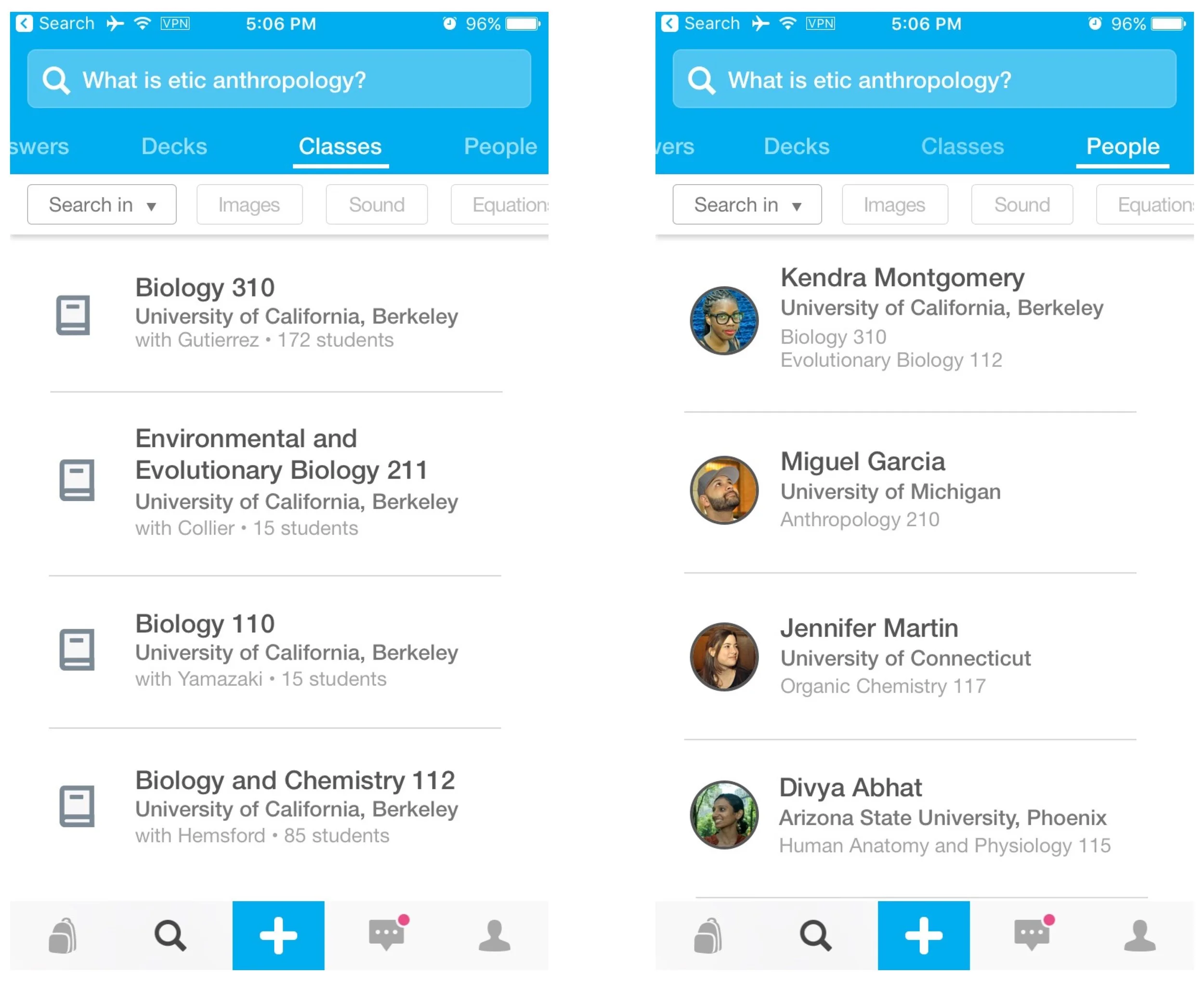My colleagues and I dissected the feature and looked at it from every angle, which led to a paradigm shift. Although we had been thinking of it as a new feature, it was also possible to frame it as a granular search tool that filled a gap in our current capability. With the current search experience, users could find decks, classes, people, etc. But they could not search for individual cards. Homework Help would solve that.