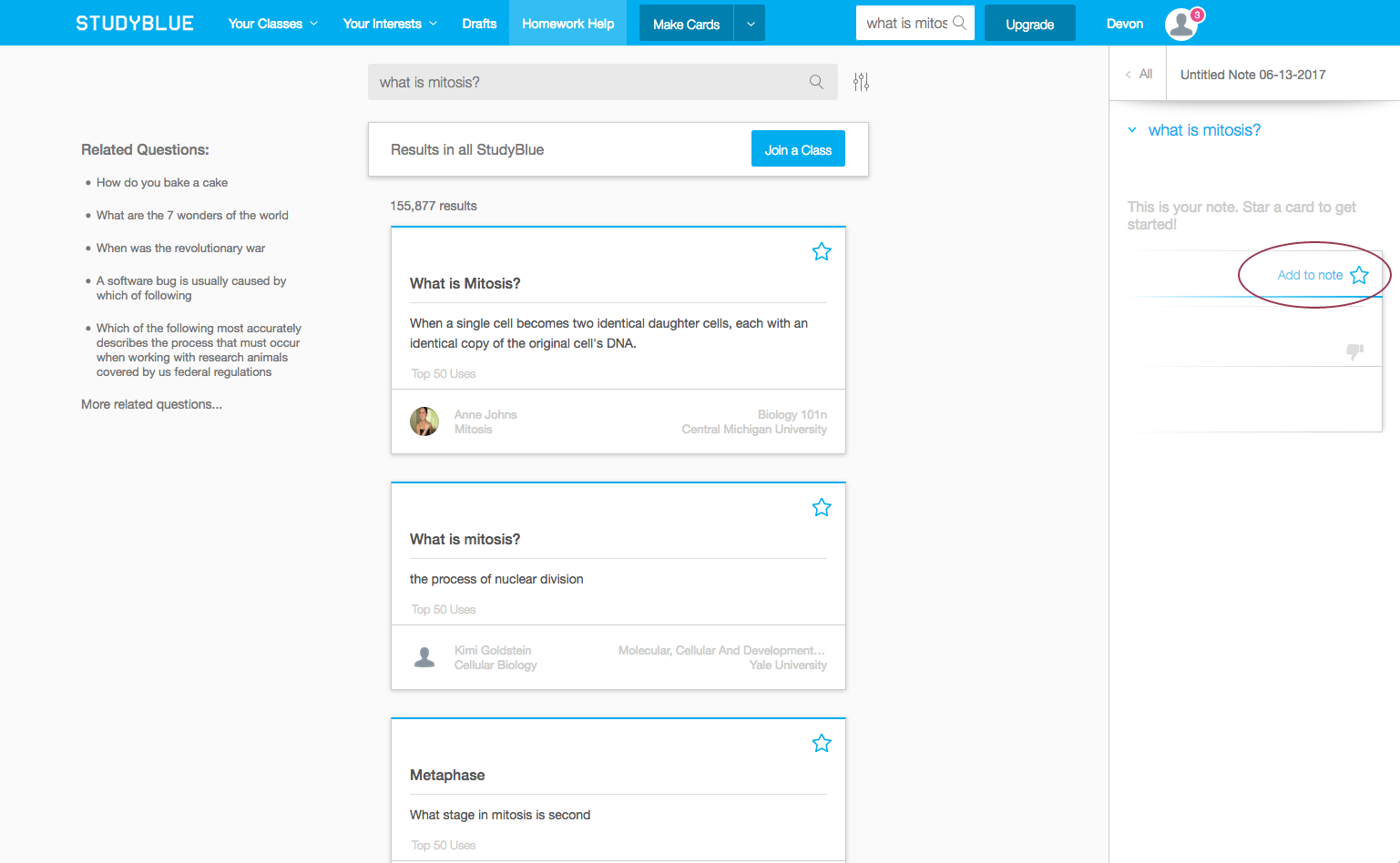 One of StudyBlue’s most ambitious features is called HomeWork Help. It allows students to ask questions and receive answers in the form of repeatable study materials.