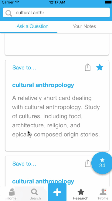 I experimented with a few solutions to quickly display notes during a mobile search. One of my favorites (see gif below) was based on this tutorial. But none of the attempts formed a true solution alongside the other design constrains. Finally, based on suggestions from my colleagues, I placed the notes section into the Home tab. Although it would not be as closely tied to the search experience, users would have immediate access to it when they opened the app.